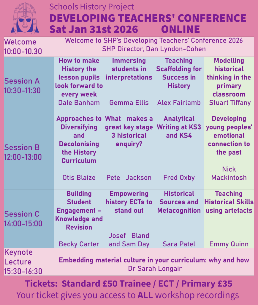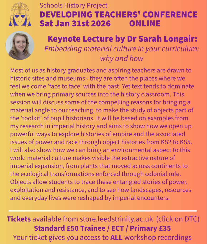 We have expanded our 2026 Conference to include 9 Secondary workshops and 3 Primary workshops, covering a wide range of topics that will support your students. And our keynote lecture from Dr Sarah Longair (University of Lincoln) on using material culture in the history classroom is going to be outstanding. As the conference is virtual, all of the workshops and keynote will be recorded, which means that your ticket gives you access to the entire conference and can be watched both live and in your own time.